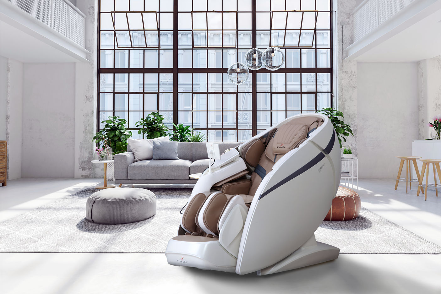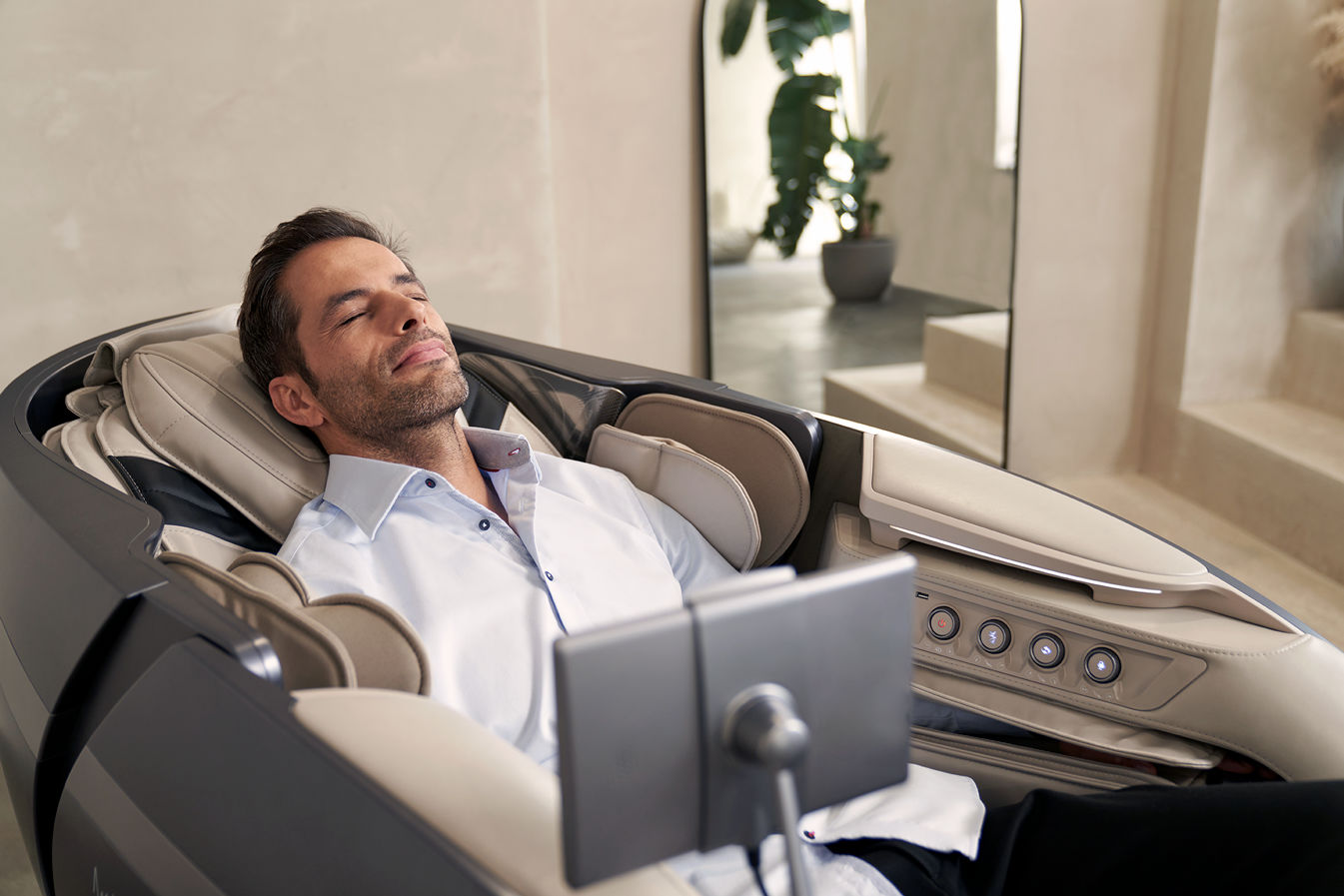 最大170度まで回転可能なモーションフレームは、座位だけでなくリクライニング姿勢も可能にし、従来のマッサージチェアと比較して背骨への圧力と緩和が向上します。
