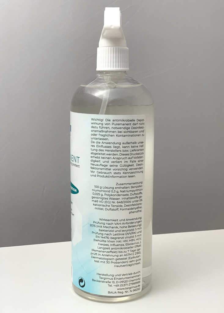ピュアマネントには0.0%のアルコールが含まれていますが、これはすぐに蒸発するためです。細菌を活性化する有効成分は最新の第4級アンモニウム化合物で、短時間で効果を発揮し、表面によく付着します。しかし、当社の消毒剤の特徴は、ピュアマネントだけが持つ添加剤です。これは、殺菌有効成分を表面に非常によく付着させることで、防腐剤のような働きをします。嬉しいのは、その効果が目に見えず、感じられないことです(べたつきがない)。それどころか、この添加剤は表面に掃除しやすい効果(掃除しやすい効果)をもたらし、限られた範囲では汚れをはじく効果さえある。何千回触っても、保護効果は持続します。その後、水や中性洗剤で洗浄しても、活性沈着物を破壊することはできません。ビデオを見る YouTubeでご覧ください。をご覧ください。